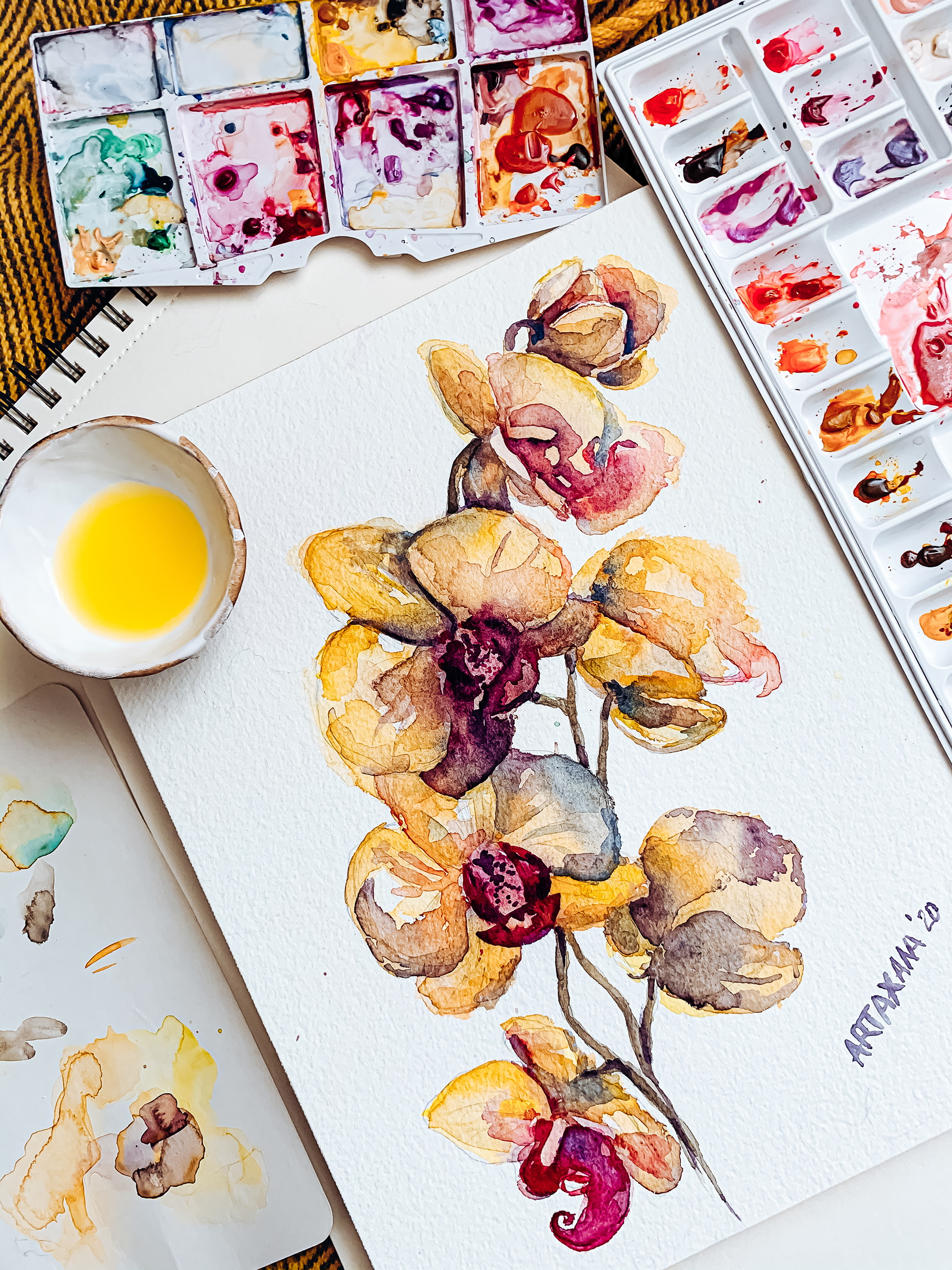 Watercolor botanical illustration “Yellow orchid”. The painting was created for wedding card. Paper: Hahnemuhle, Leonardo 600mg, raw. Watercolor: Winsor and Newton. Brush: Escoda.